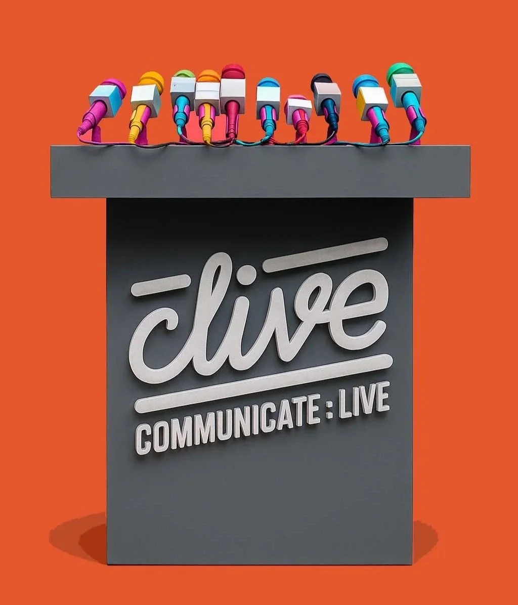 The new identity featured a hand-drawn logo, the tagline Communicate Live, and a family of 3D robots that became Clive’s mascots across campaigns, content and 3D-printed sculptures.