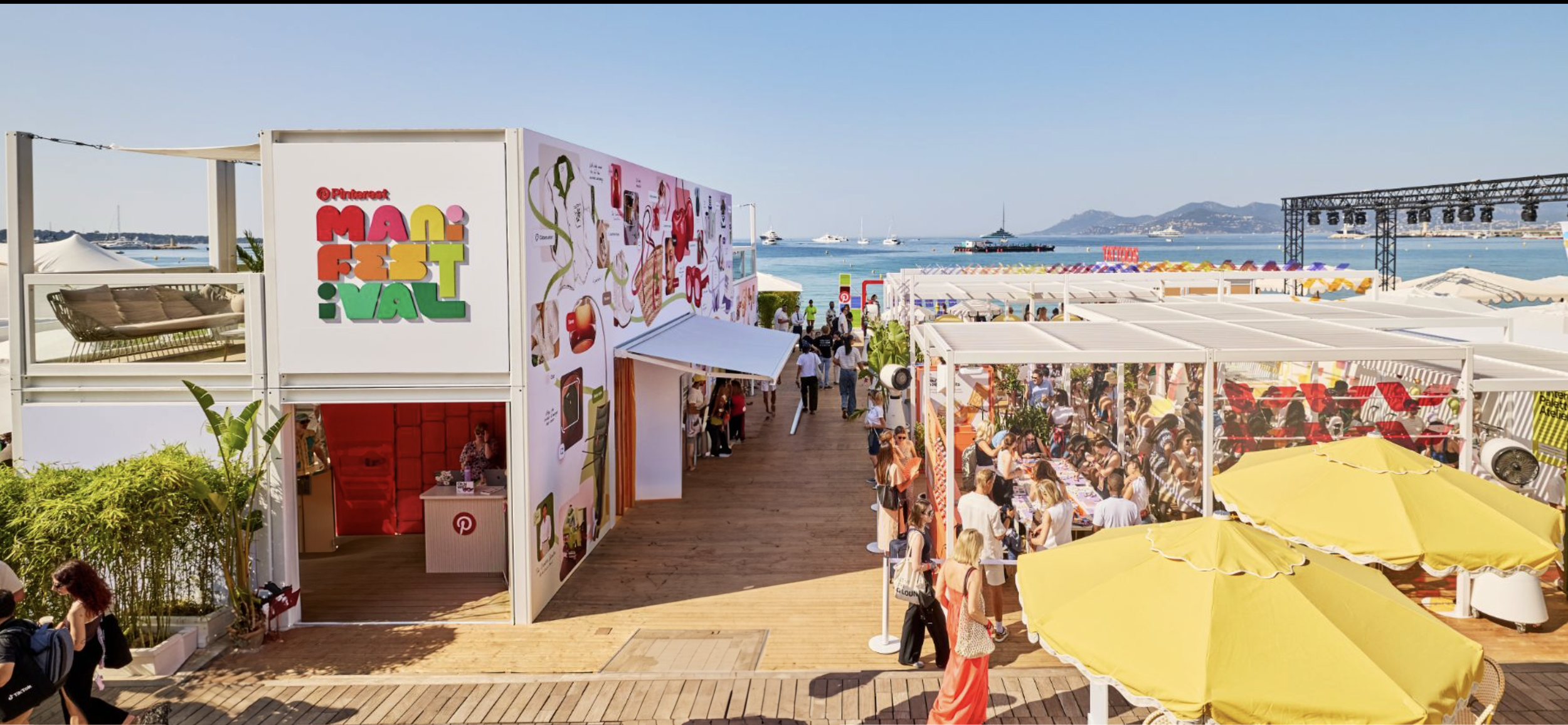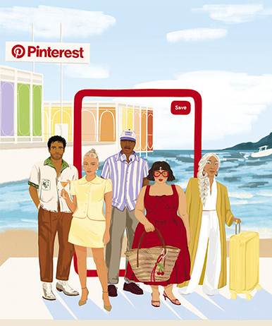 Our writing and art direction teams crafted a story of five imagined Cannes attendees, each discovering their perfect festival look through Pinterest visual search features. They then partnered with illustrator Izzy Lawrence to bring these characters and their discoveries to life in a hero mural that stretched across the double-decker facade of our structure. Part brand storytelling, part public art, the piece became a defining backdrop for the Pinterest Manifestival in Cannes 2025.